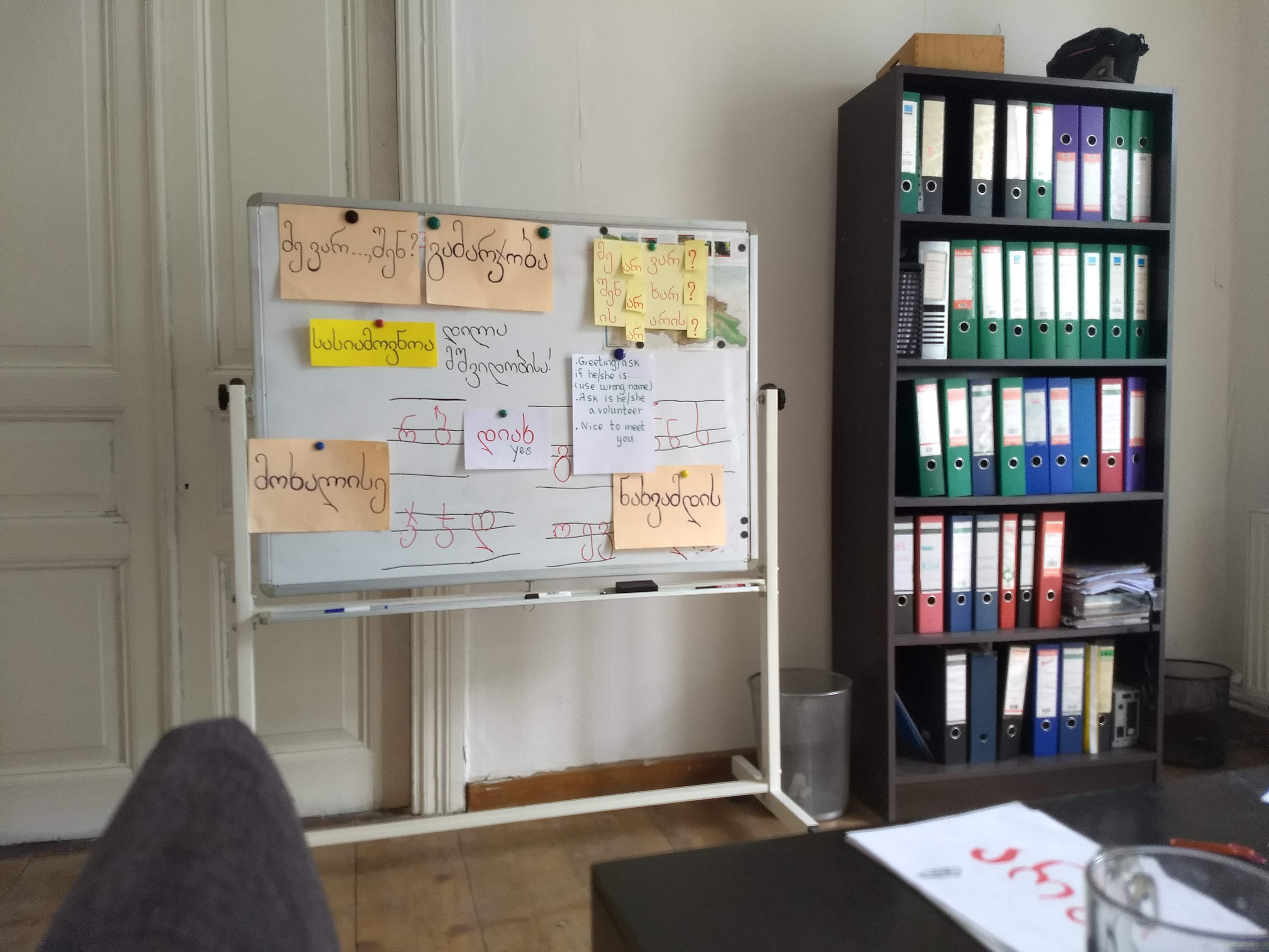 Am Tag darauf (Samstag, 17.08.) durften wir dann unsere erste Georgisch-Stunde mit unserer motivierenden und motivierten Lehrerin Lela genießen. Für den Anfang halten wir uns bisher an das Buchstaben lernen (33 neue Buchstaben sind nicht ohne aber ich habe das Gefühl, dass es von mal zu mal besser wird) und Redewendungen für die Begrüßung und ähnliches, sowie Essen und Zahlen, was wir gestern (21.08.) auch mal alleine im Restaurant mit mehr oder weniger erfolgreich funktioniert hat. Am Nachmittag folgte dann ein Seminarteil von Levan zur Geschichte Georgiens, die aufgrund der geostrategischen Lage sehr interessant ist und wo sich die Einflüsse vieler verschiedener Kulturen zeigen. Fun Fact: Es gab zur Zeiten des römischen Imperiums laut Levan eine Statue des damaligen georgischen Königs in Rom, da dieser quasi das Bollwerk gegen Nomaden im heutigen Russland bildete.